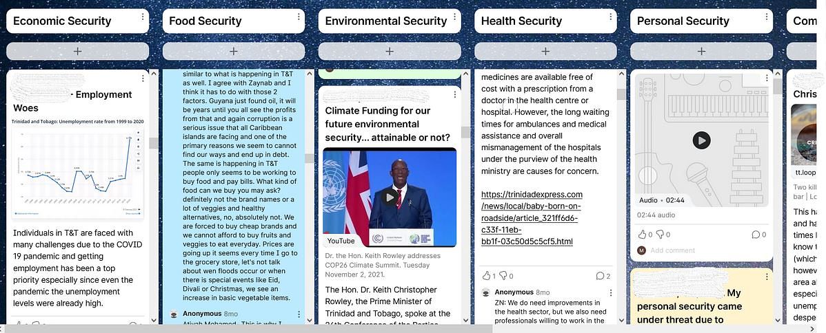 In another activity, students are asked to identify and briefly discuss the cases of (in) securities based on the Human Security Framework (United Nations Trust Fund for Human Security). It is a good illustration of how learning style can impact the approach to the same activity by different students and, simultaneously, satisfy their needs of autonomy (they decide how to respond to each Security padlet) and competence. Some students search for written data and provide links, while others upload videos or record a short audio file illustrating their experience of selected Human Security (e.g., look at the Personal Security in the image above with personal reflection by the student). Based on the students' feedback, the Padlet software activities were one of the favorite.