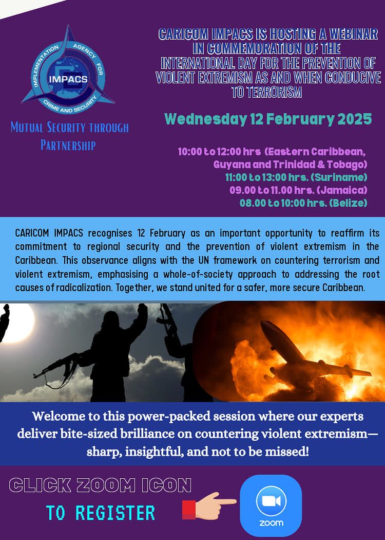 Commemoration of the International Day for the Prevention of Violent Extremism as and when Conductive to Terrorism on the topic Best Practices in Countering Radicalization and Empowering At-Risk Communities. Organized by CARICOM IMPACS, February 12th, 2025.